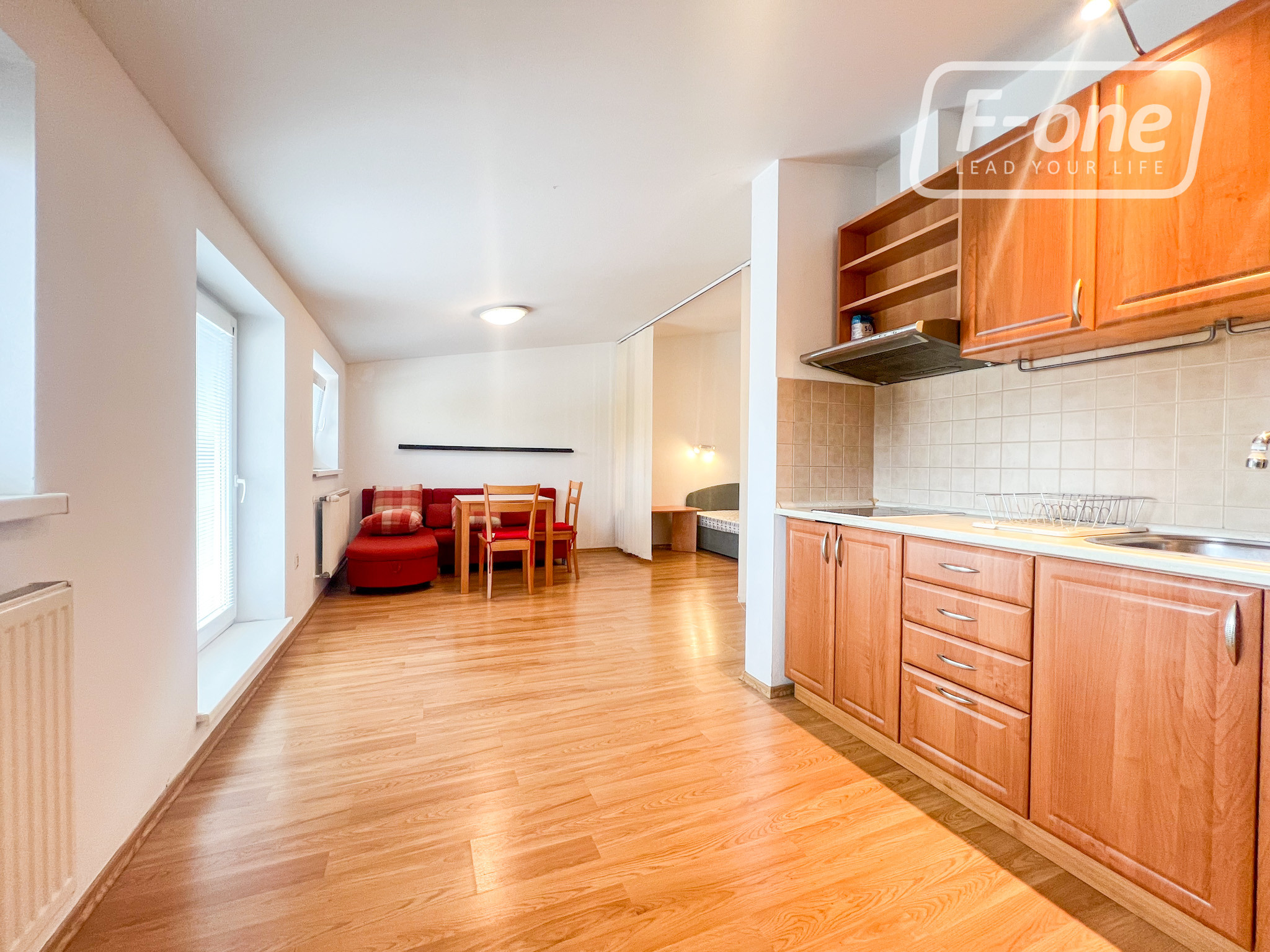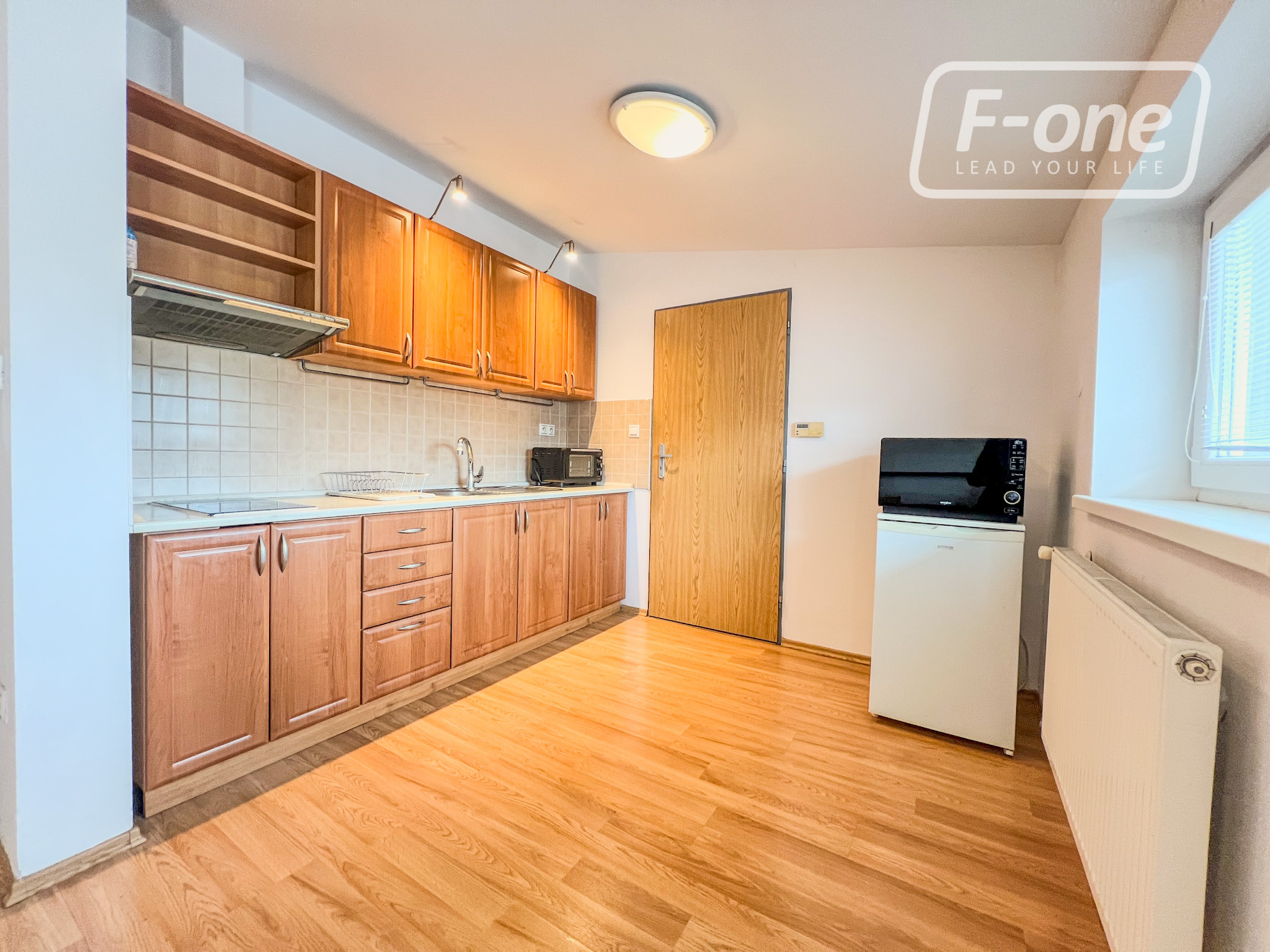 Dispozícia pozostáva zo vstupnej chodby, kúpeľne s WC, obývacej izby s kuchynským kútom a prakticky oddelenej posteľnej zóny. Prenajíma sa zariadený tak, ako je zachytené na fotografiách; k dispozícii je kuchynská linka so spotrebičmi, jedálenský stôl so stoličkami, sedačka, posteľ a úložný nábytok.